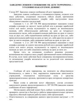 ПОМНИТЕ! Ваши слова и действия могут образовать состав уголовно-наказуемого деяния, предусмотренного ст. 207 УК РФ (заведомо ложное сообщение об акте терроризма).